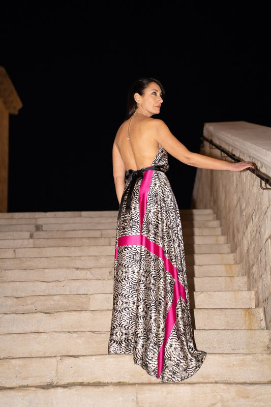 Abito Red Carpet lungo in satin animalier optical con scollo americano e spacco