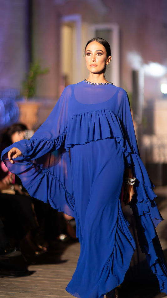 Abito Red Carpet A-Line con mantello in georgette blue royal - PREORDINA