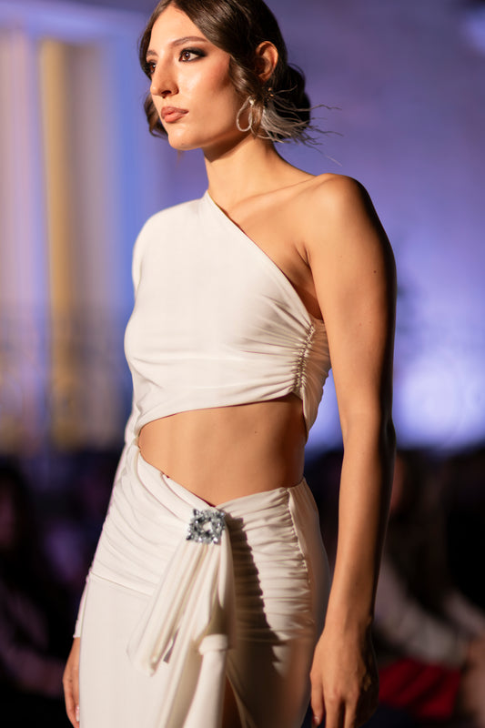 Abito Red Carpet bianco monospalla aderente con spacco e manica lunga - PREORDINA