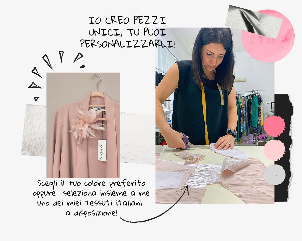 Se desideri un abito, un completo o un capo quotidiano creato sulle tue forme, progettato per i tuoi punti di forza e adatto alla tua vita reale, possiamo farlo insieme. Una consulenza gratuita ti aiuterà a scegliere colori, volumi, tessuti e dettagli.