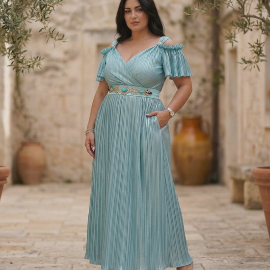 13. Abito lungo cerimonia elegante verde acqua in plissè metallizzato - PLUS SIZE