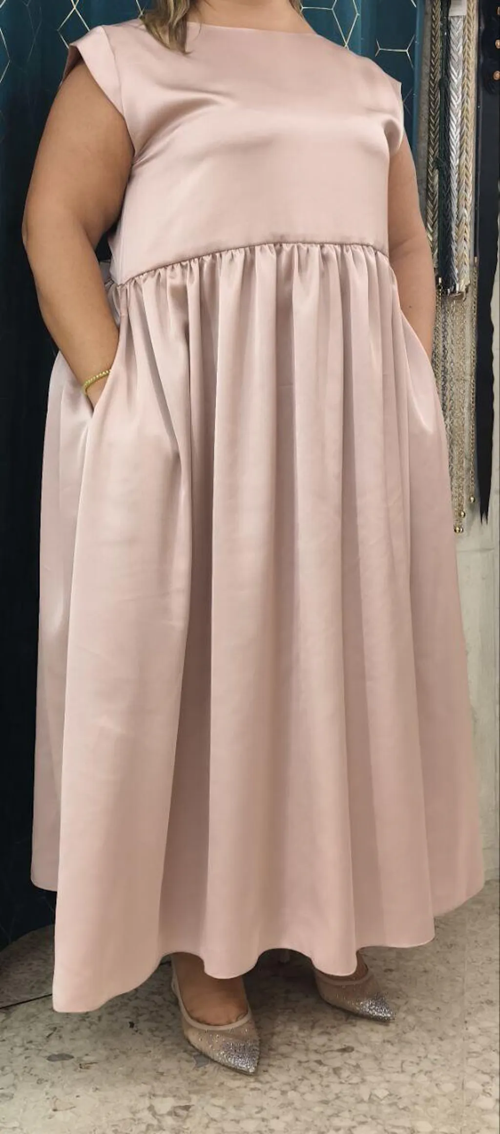 19. Abito lungo con scollo a V e tasche laterali nascoste in raso rosa cipria - PLUS SIZE