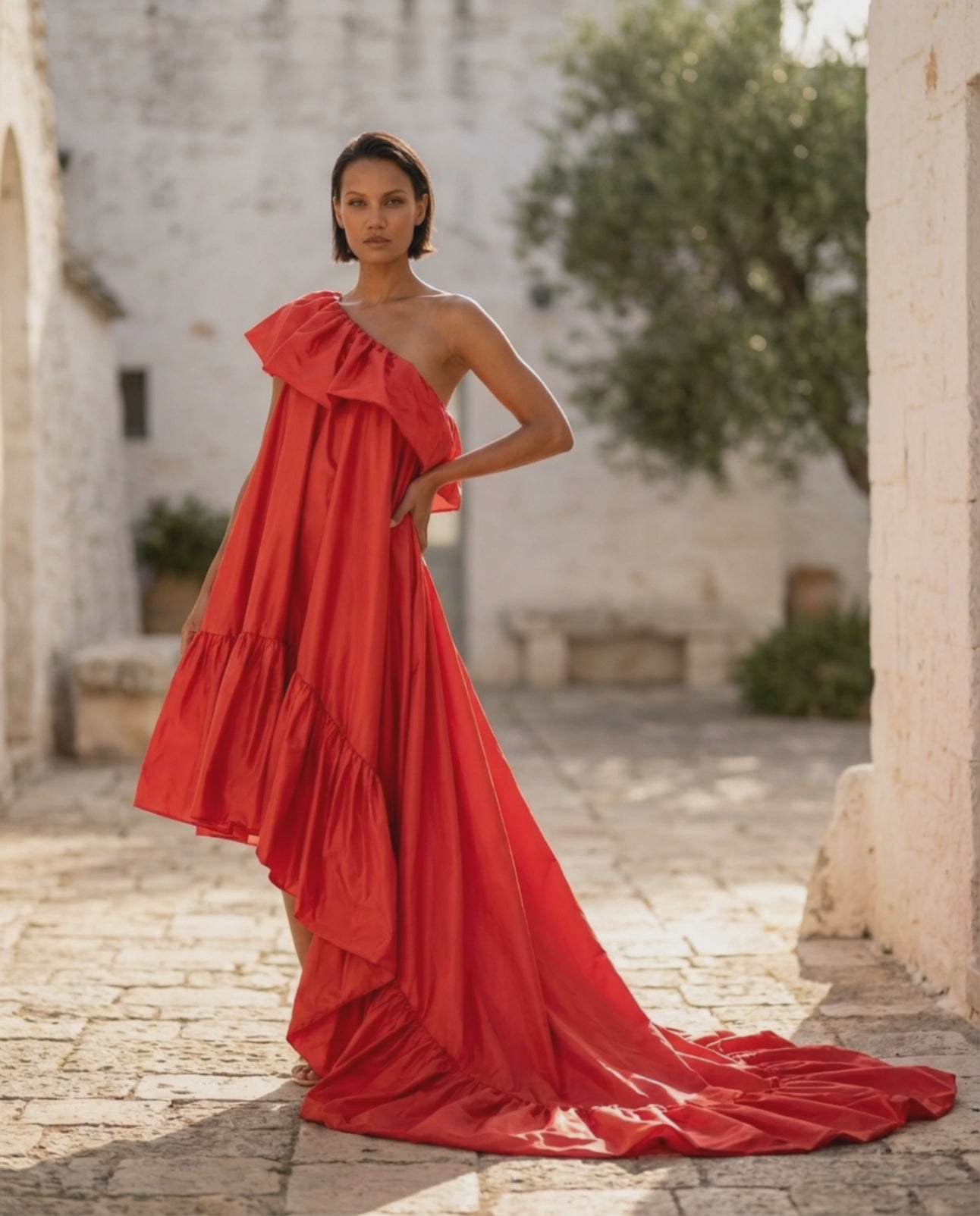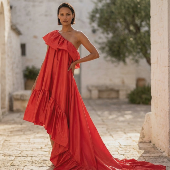 12. Abito Red Carpet Lungo monospalla con maxi rouche rosso corallo