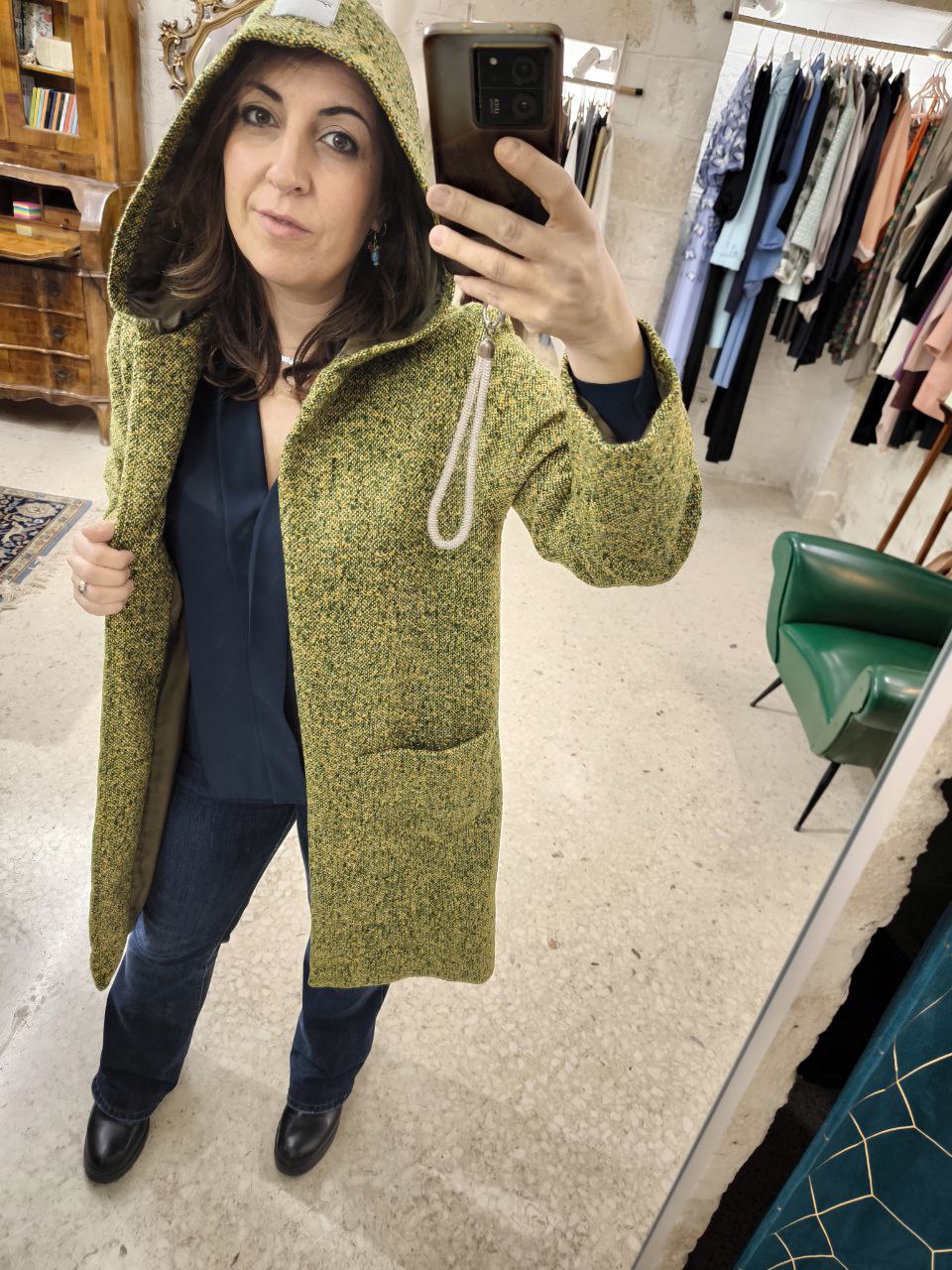 Cappotto corto sartoriale con cappuccio in tweed di lana verde