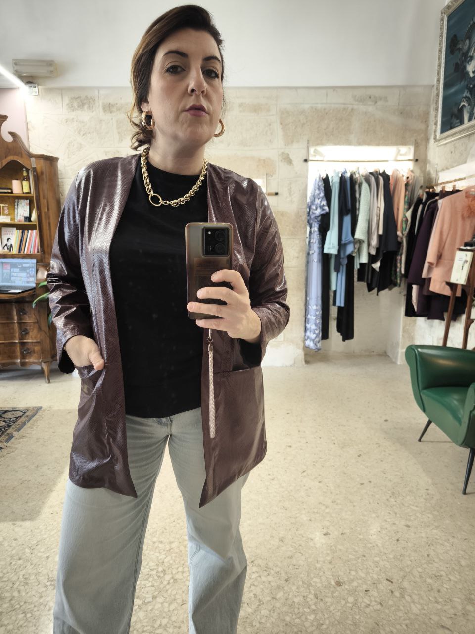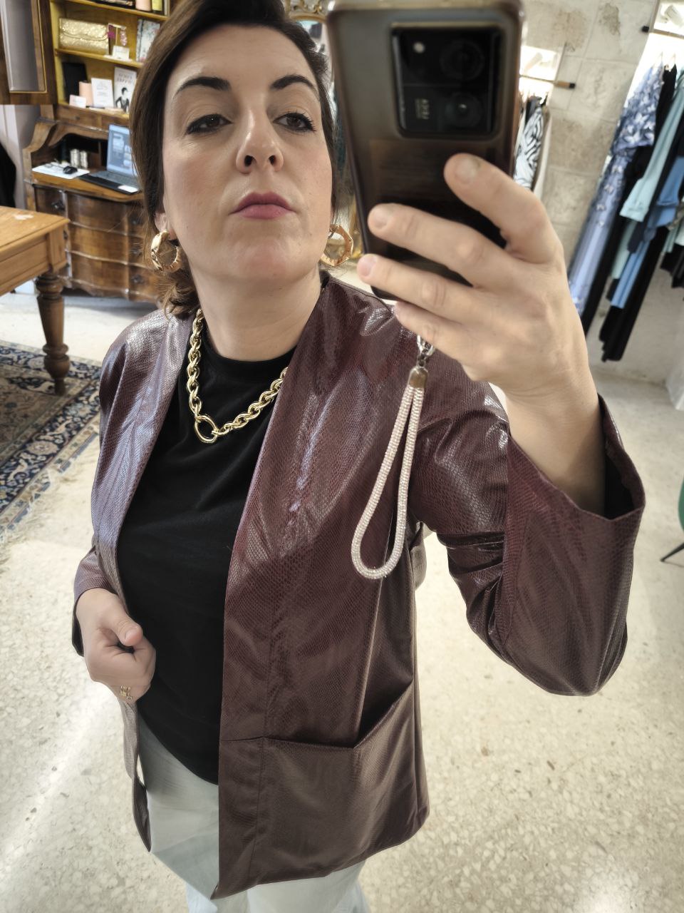 Giacca destrutturata con tasche nascoste in ecopelle pitonato bordeaux - PREORDINA